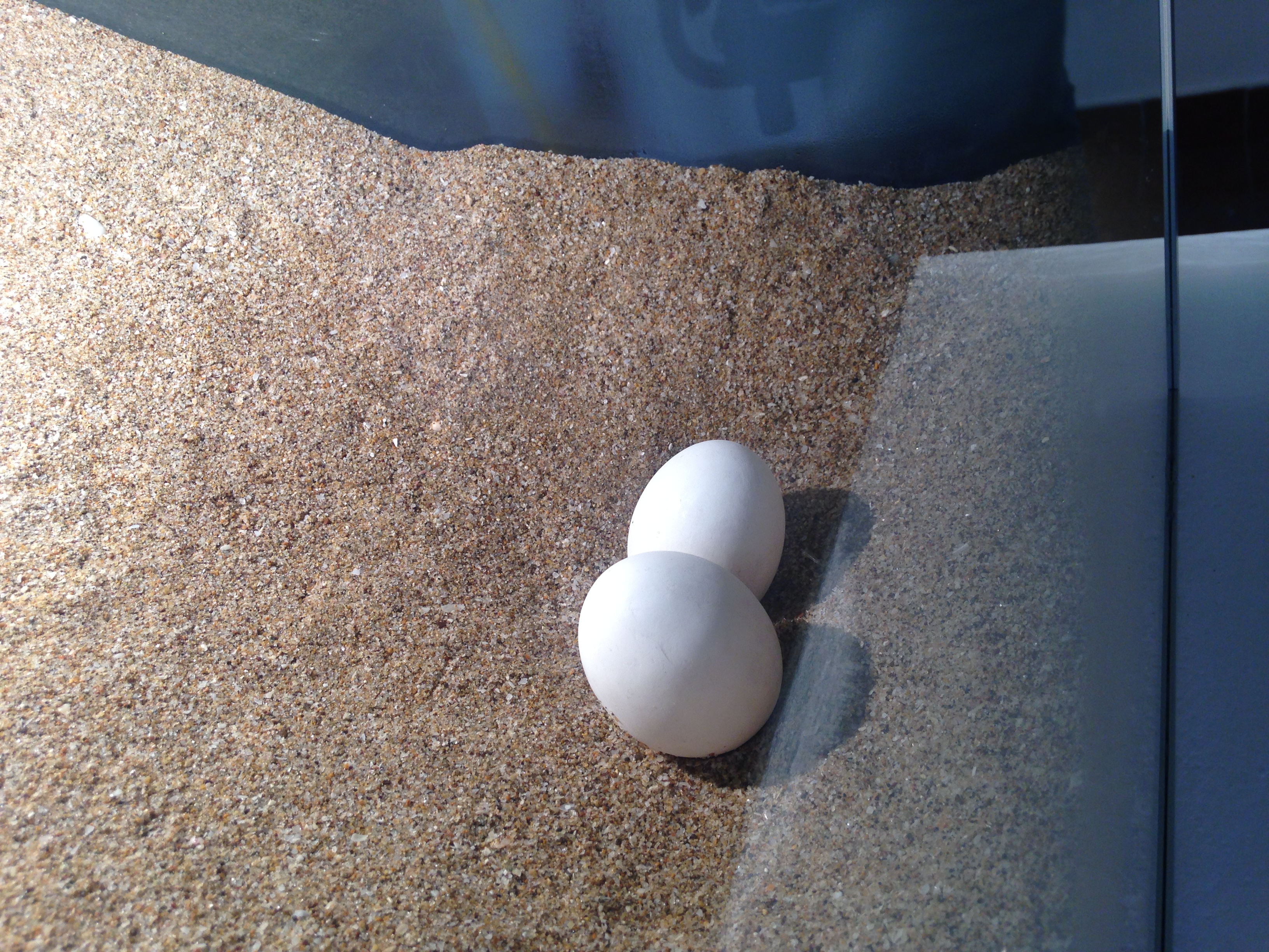 Caja de vidrio con foco, arena y dos cascarones de huevo.